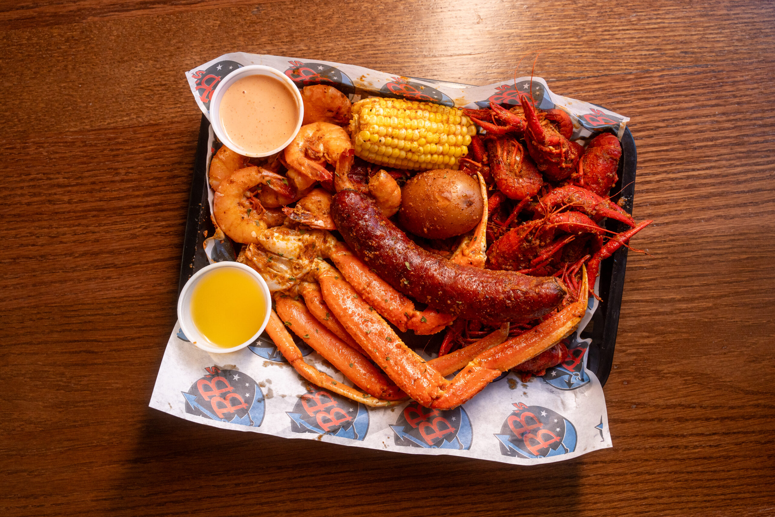 BB’s Countdown to Crawfish Boil is available now through Sunday, January 18, for $24.99 (dine-in only). The mouthwatering platter includes one pound of flash-frozen crawfish, one snow crab cluster, 10 boiled shrimp, half a link of garlic sausage, corn and potato, plus dipping sauce and butter. (Photos by Sergio Trevino)